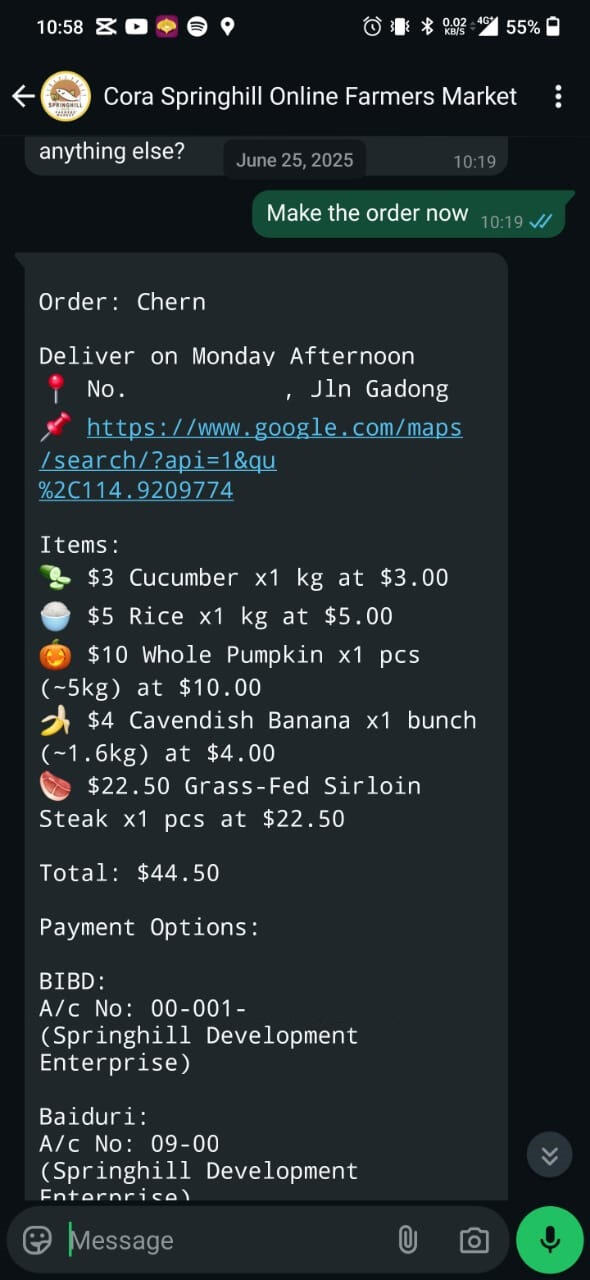 💬 Cora automates the entire Springhill digital farmers market on Meta platforms and has completed over 1000 transactions.