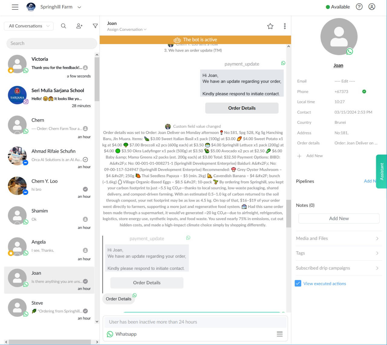 🧑🌾 Cora from Springhill Farm supports 600+ homes with automated replies, broadcasts, and operations — fully trained for real business use.